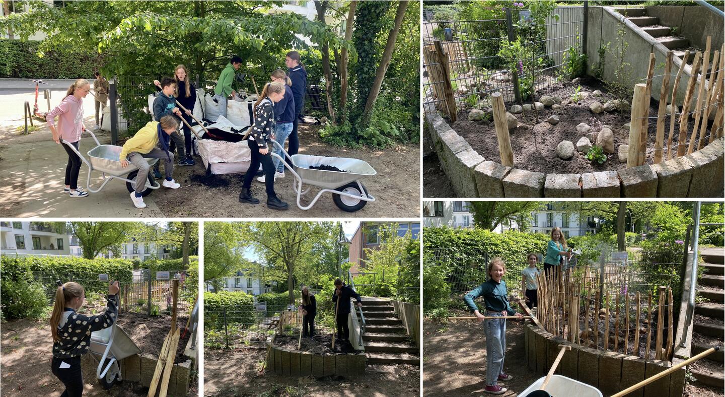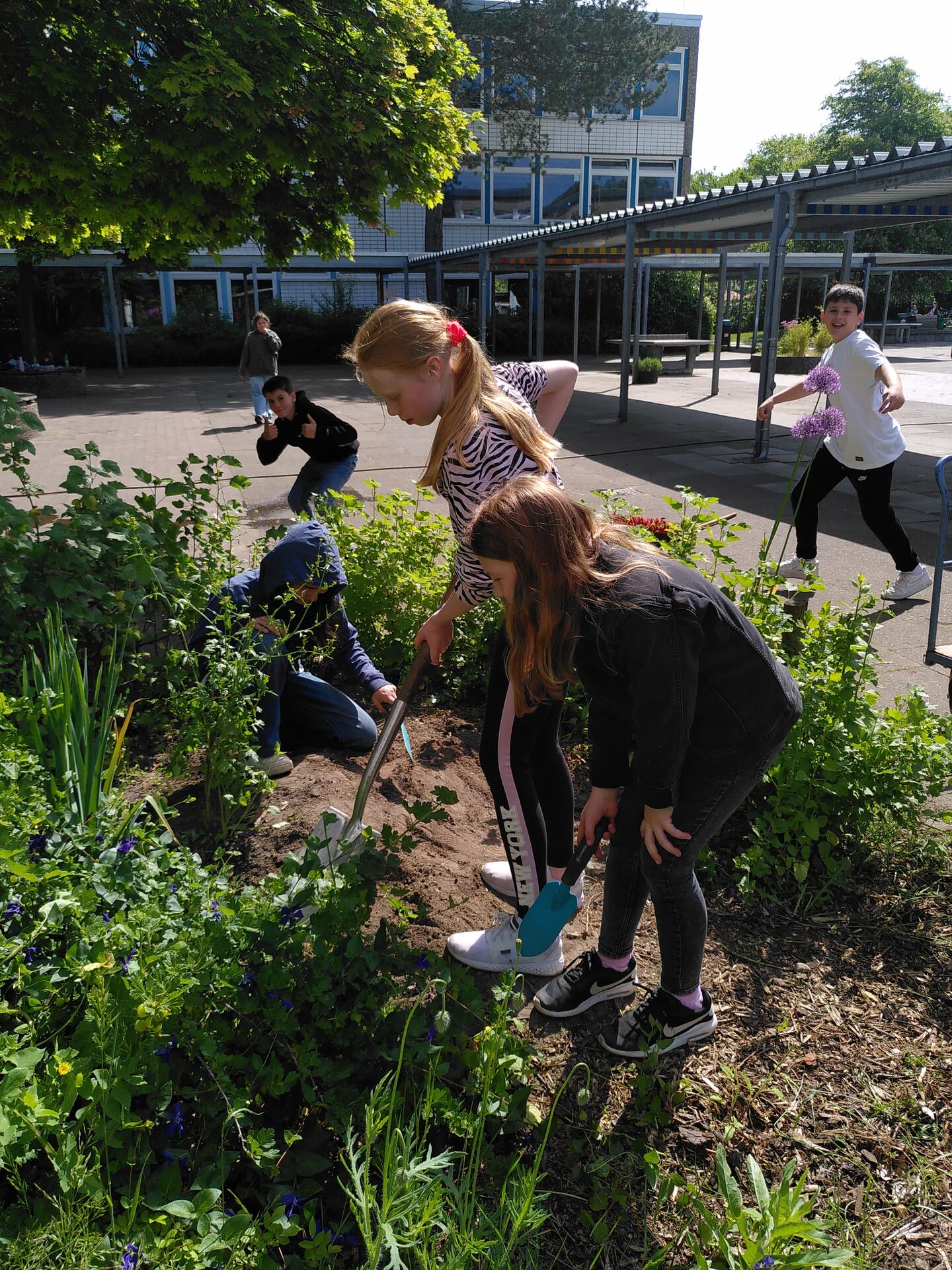 Die AG engagierte sich, den Schulhof, wo es geht zu entsiegeln, Beete anzulegen, Bewässerungssysteme zu legen, Stauden und heimische Gehölze zu pflanzen und Saatgut zu säen. Vertretungsstunden wurden zum Einsatz für die naturnahe Gestaltung der Schulflächen genutzt. Mehrere Flächen wurden so bereits gestaltet. Dabei wurde ein Mensagarten mit einem Sand-Humus-Gemisch aufgefüllt, mit Feldsteinen terrassiert und befestigt. Viele Schüler sind begeistert dabei und die Schulgemeinschaft wertschätzt die neue Gartengestaltung.