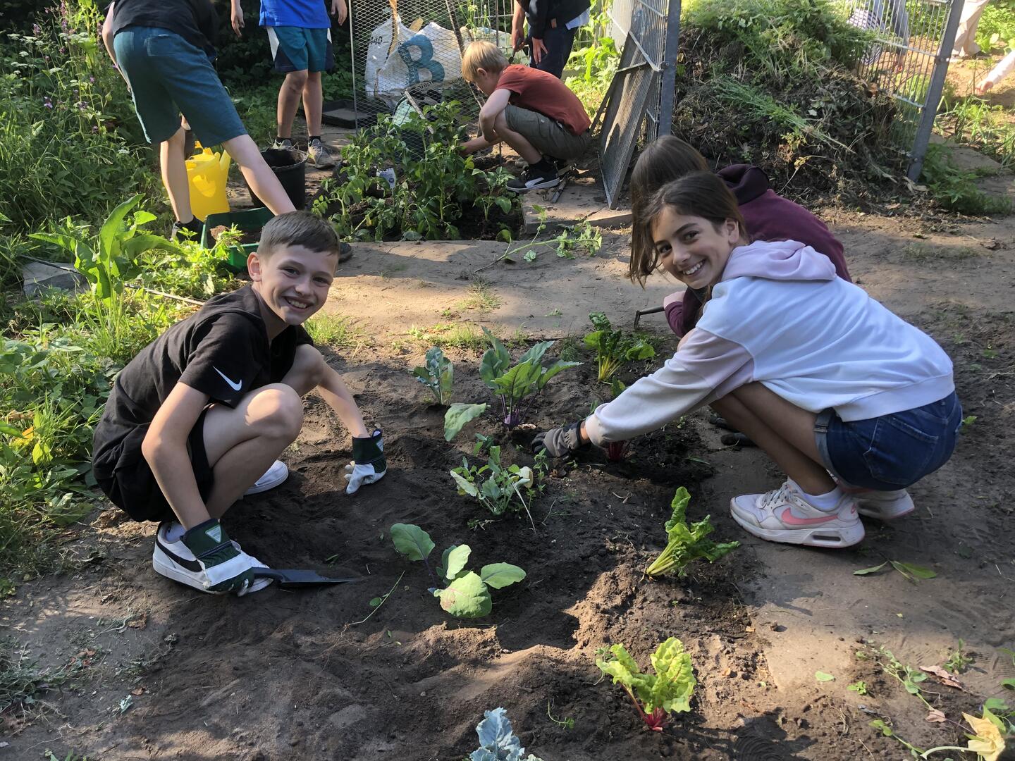 Start für einen Schulgarten, in dem auf Beeten und Hochbeeten, in Kräuterspiralen und Kübeln Gemüse und Wildpflanzen, Beeren und Kartoffeln, Kürbis und Paprika wachsen. Bei kleinen Festen wurde das Geerntete geschmaust und Sonnenblumenkerne wurden im Winter auf dem Basar als Vogelfutterringe verkauft. Ein Komposthaufen darf nicht fehlen und ein Thermokomposter macht die Küchenabfälle der Lehrküche für den Garten nutzbar.