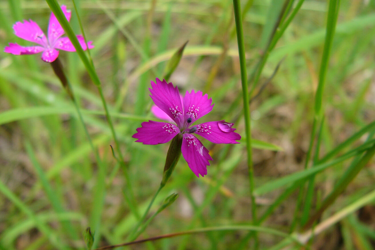 2012 will die Loki Schmidt Stiftung die Heidenelke (Dianthus deltoides) ins öffentliche Bewusstsein rücken. Die Stiftung möchte hiermit auf den dringend notwendigen Schutz dieses heimischen, wildwachsenden Nelkengewächses aufmerksam machen. Darüber hinaus sollen vor allem aber die bedrohten Lebensräume der Heidenelke ins öffentliche Bewusstsein gerückt werden. Dies sind Heidegebiete, trockene Wiesen und Wegränder auf mageren, kalkarmen Böden. Häufig kommt sie zusammen mit Bauernsenf, Johanniskraut, Silbergras, Kleinem Habichtskraut und Berg-Sandglöckchen vor. Zuweilen sind Besenginster, Birken und Besenheide eingestreut. Die Heidenelke ist besonders geschützt. Ihr bundesweiter Rückgang beruht auf der intensiven Nutzung der Landschaft. So werden Magerwiesen und Sandtrockenrasen aus wirtschaftlichen Gründen in Acker, Grünland oder Forst umgewandelt. Am Rande der Dörfer und Städte werden solche Flächen gern als Bauland ausgewiesen bzw. in Sportanlagen oder Kleingärten umgewandelt. Gärtnerische Gestaltung der verbliebenen Wegränder und Freiflächen beseitigt nicht selten ihre letzten Rückzugsorte. Auch Stickstoffeinträge durch die Luft, Landwirtschaft oder zum Beispiel Hundekot gefährden den Lebensraum der Heidenelke. So ist es nicht verwunderlich, dass die hübsche Heidenelke und ihre Begleitflora gefährdet sind.