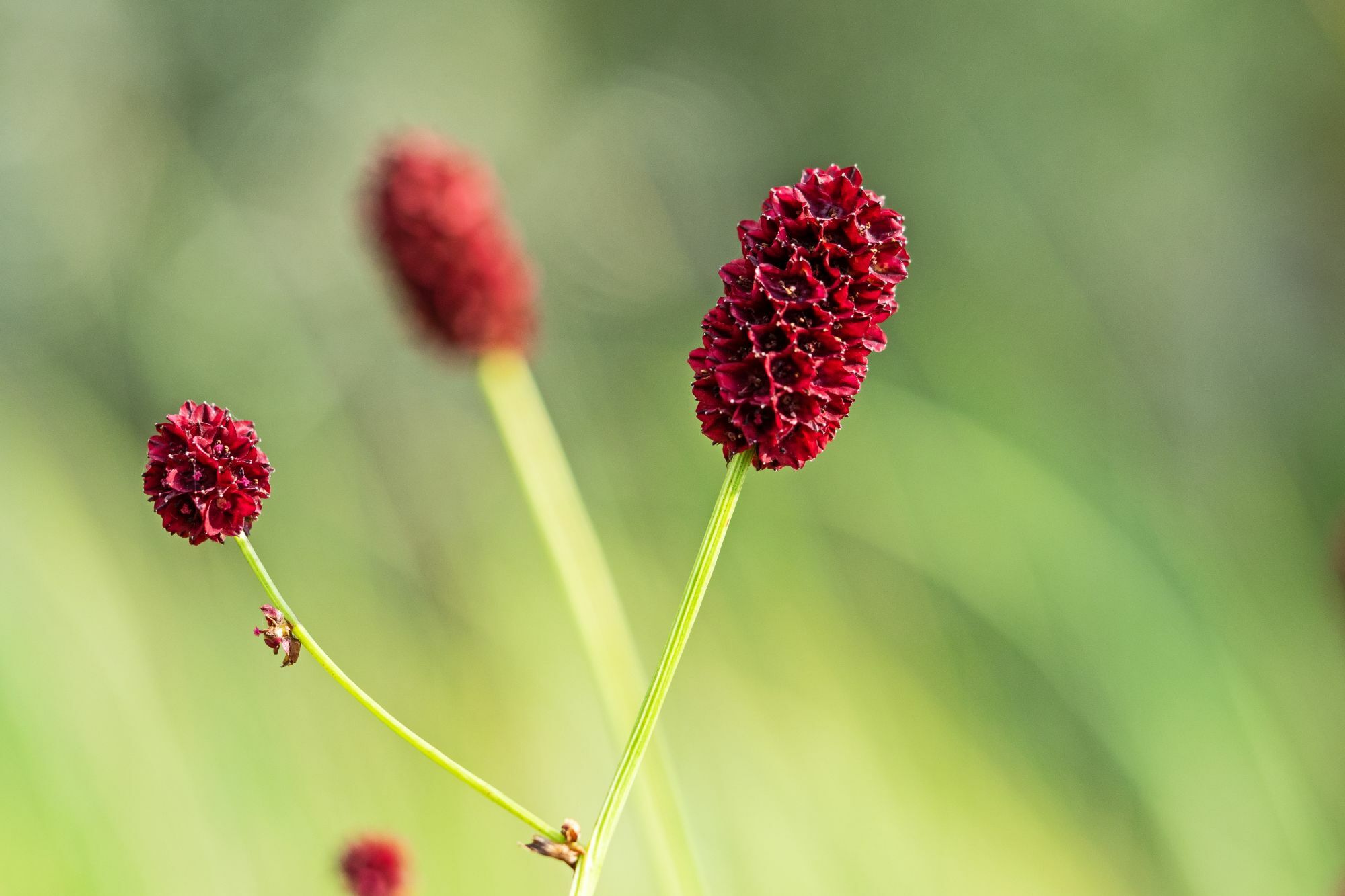 Der Große Wiesenknopf gehört zu den Rosengewächsen und ist nicht zu übersehen mit seinen dunkelroten Blütenköpfen, die sich zwischen Mitte Juni und Mitte September ausbilden. Pro Blütenstand wachsen 20 bis 40 Einzelblüten, die zwittrig sind und stets von der Spitze zur Basis hin aufblühen. Die ausdauernde, krautige Pflanze erreicht eine stattliche Wuchshöhe von 50 bis 120 cm. Wie hoch ein einzelnes Individuum wachsen kann, ist sehr stark von den Standortverhältnissen wie der Nährstoffverfügbarkeit im Boden abhängig.