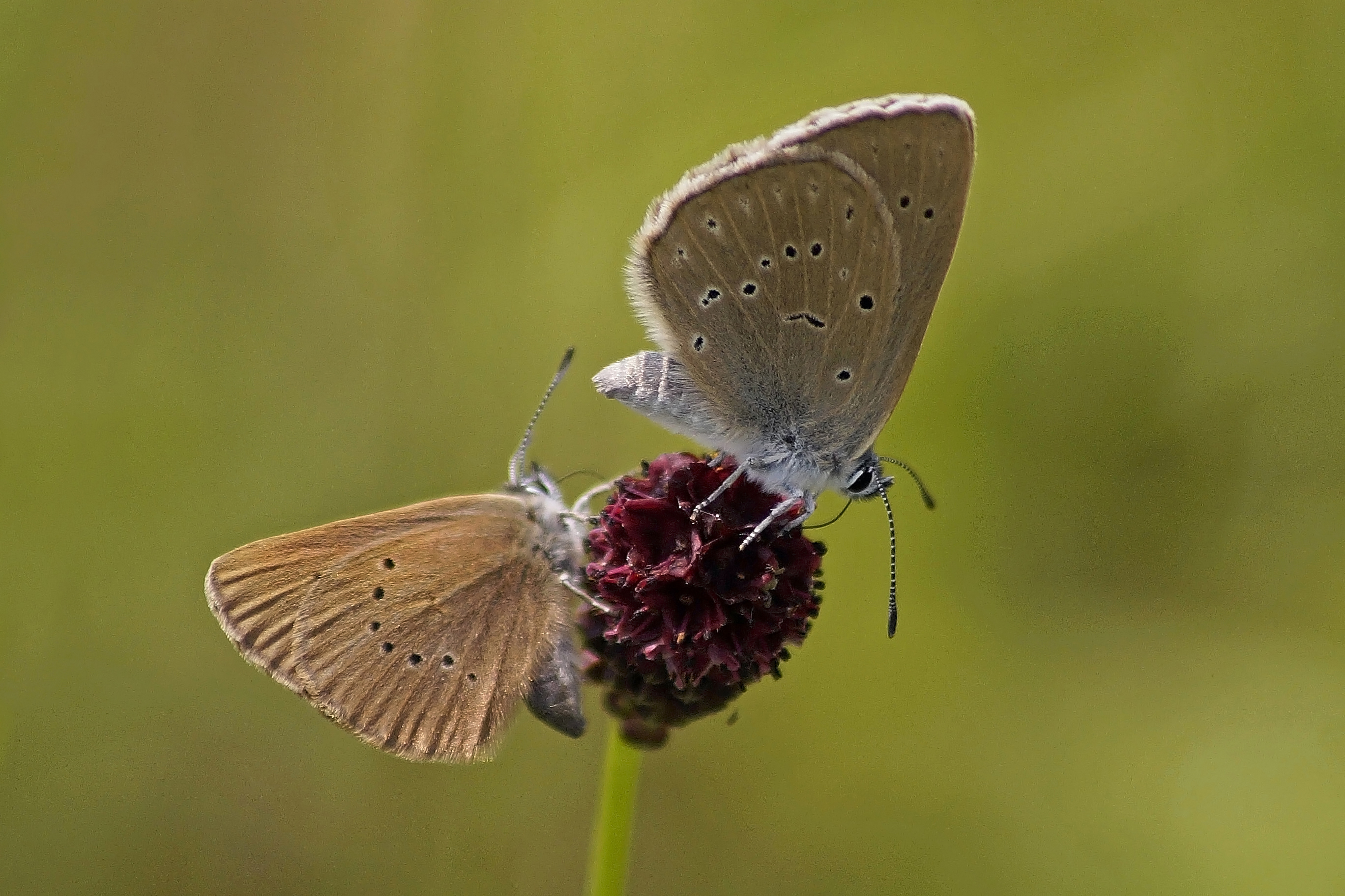 Noch bis Mitte September erstreckt sich die Blütezeit des Großen Wiesenknopfes (Sanguisorba officinalis). Doch die leuchtendroten Blüten, die auf feuchten Wiesen in ca. einem Meter Höhe normalerweise nicht zu übersehen sind, sind immer seltener zu entdecken. Die Bestände der Wildpflanze gehen besorgniserregend zurück. In Deutschland steht der Große Wiesenknopf bereits auf der Vorwarnliste der Roten Liste der gefährdeten Pflanzen. Damit ist auch das Überleben des Hellen und des Dunklen Wiesenknopf-Ameisenbläulings gefährdet, denn diese beiden Schmetterlingsarten sind vom Vorkommen des Großen Wiesenknopfes abhängig.