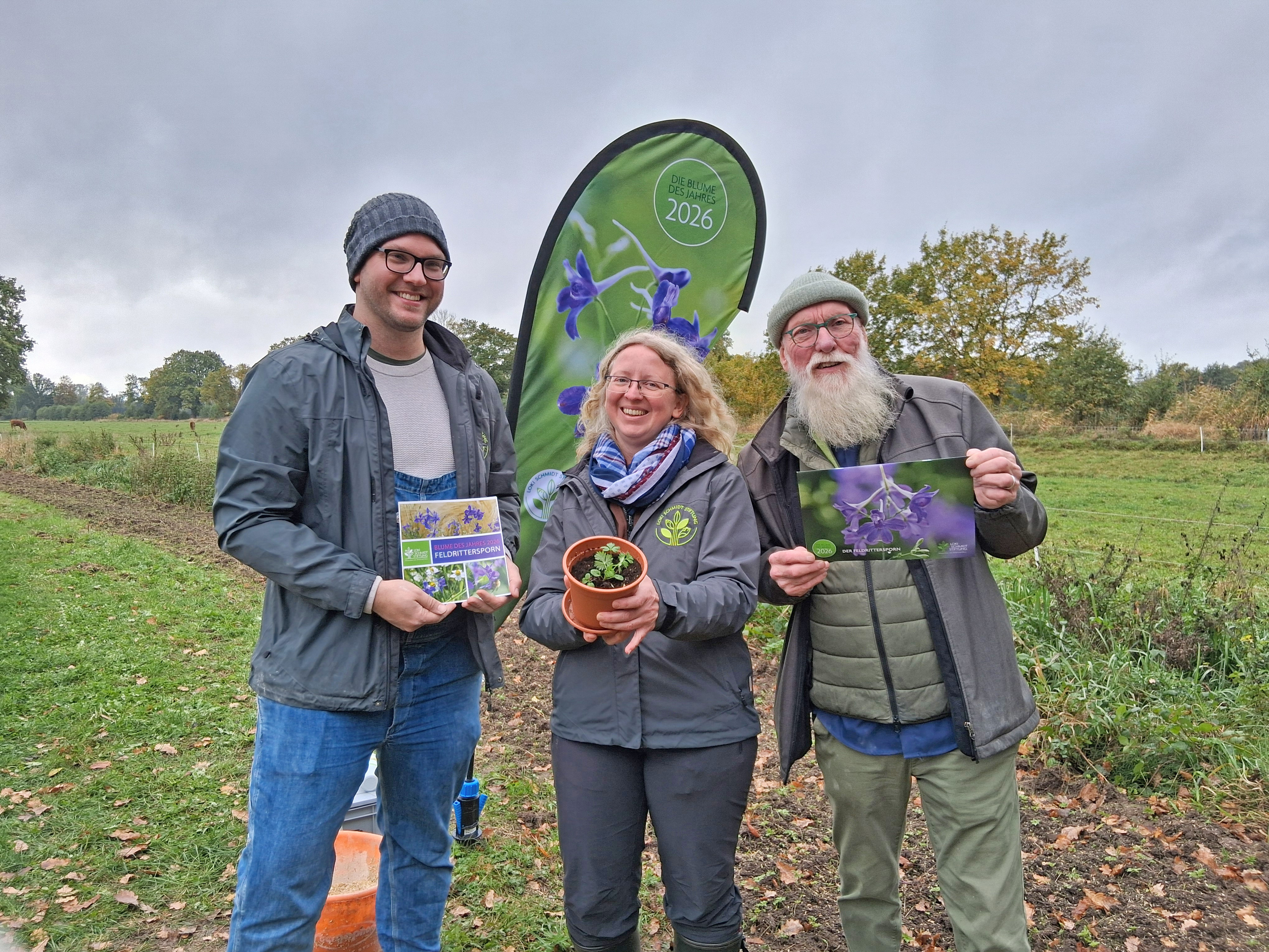 André Palm, Dr. Kristin Ludewig und Gartenbotschafter John Langley stellten die Blume des Jahres 2026 vor – Foto: Loki Schmidt Stiftung