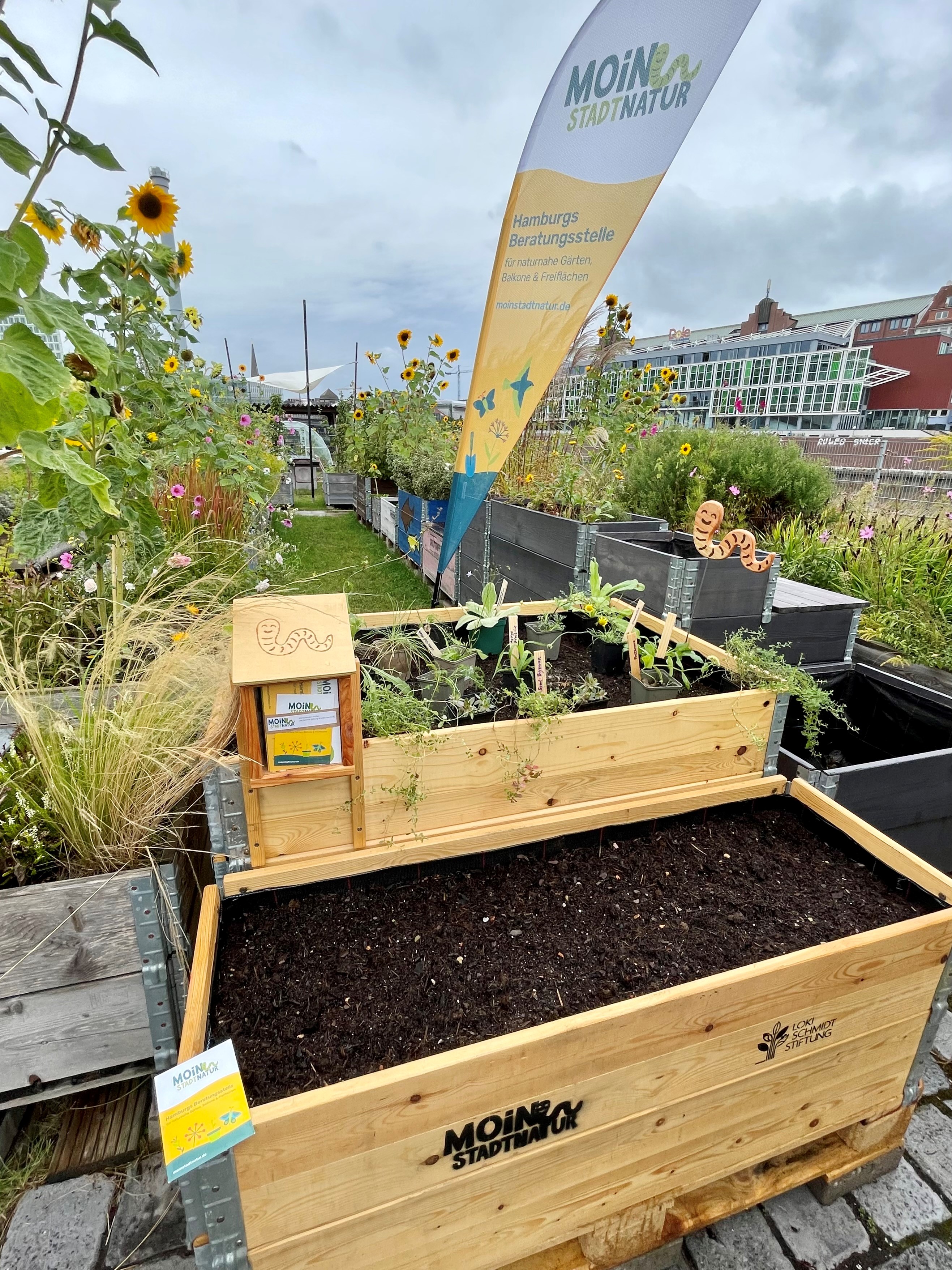 Königskerze, Färberkamille, Schafgarbe, Sand-Thymian, Hauswurz und Co.: Das MOIN STADTNATUR-Hochbeet im Oberhafengarten zeigt eine Vielfalt an heimischen Wildstauden, die im eigenen Garten oder auf dem Balkon nicht nur für Farbvielfalt sorgen, sondern auch Insekten ein reichhaltiges Nahrungsangebot sowie einen Lebensraum bieten. In ein weiteres kleineres Hochbeet ist die MOIN STADTNATUR Wildblumensaat ausgesät worden. Besucher*innen können dort in den nächsten Wochen beobachten, wie die Pflanzen keimen und wachsen werden. Dieser kleine Schaugarten, den das Projekt MOIN STADTNATUR in Kooperation mit GRAU TRIFFT GRÜN gestaltet hat, ist jederzeit öffentlich zugänglich und soll als Inspiration für die eigene naturnahe Garten- und Balkongestaltung dienen.