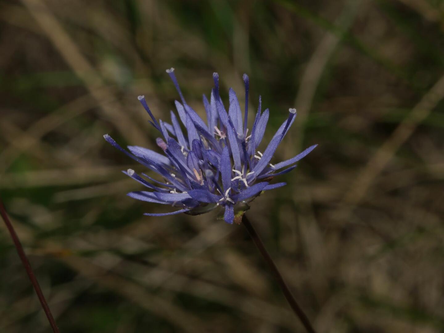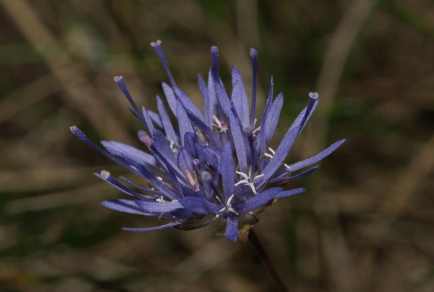 Das Sandköpfchen hat viele deutsche Namen: Bergnelke, Sandknöpfchen, Schaf-Skabiose, Berg-Sandglöckchen. Nur der letzte Name weist darauf hin, dass das Sandknöpfchen zu den Glockenblumengewächsen gehört. Das ist aber erst zu erkennen, wenn man die winzige Einzelblüte betrachtet.