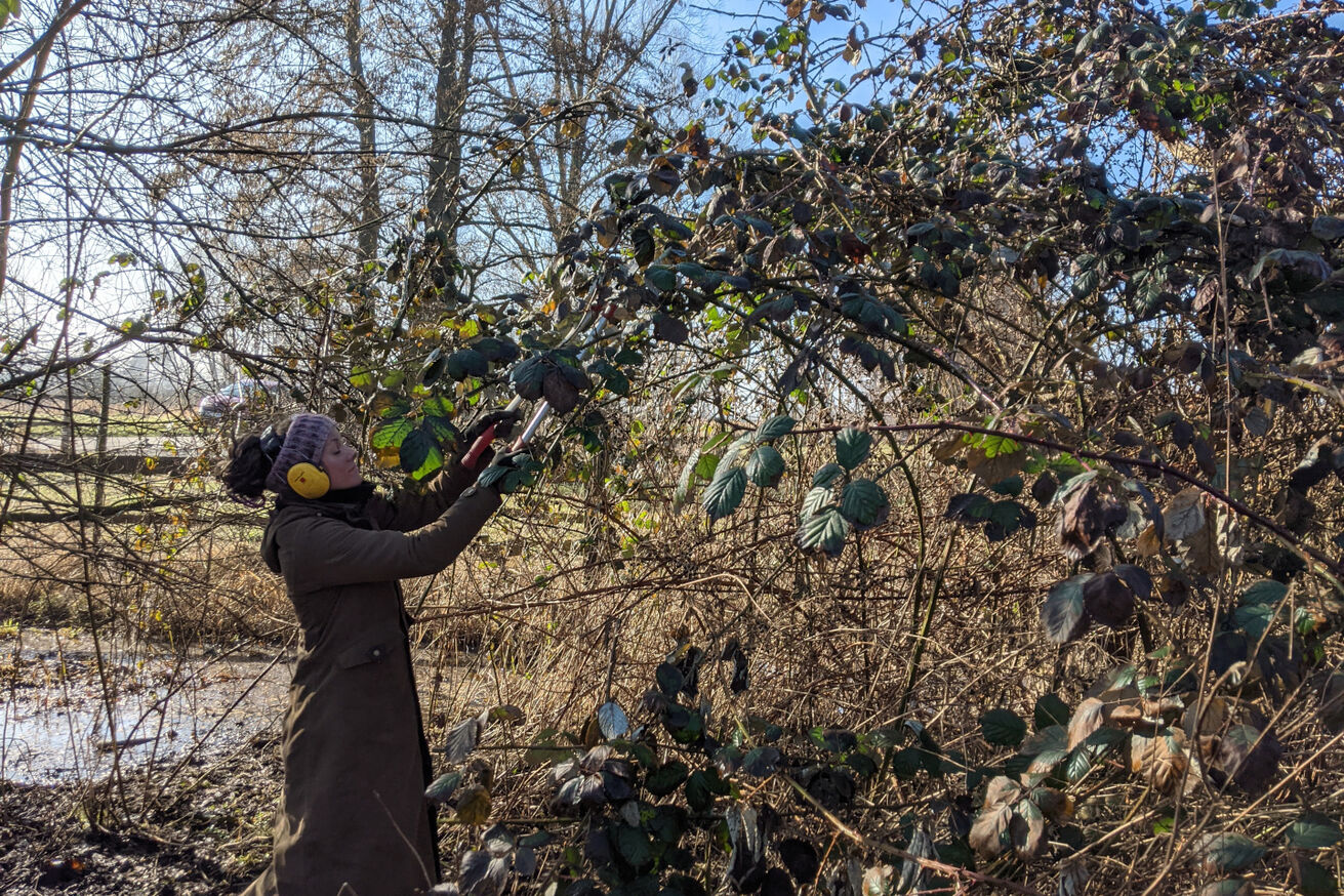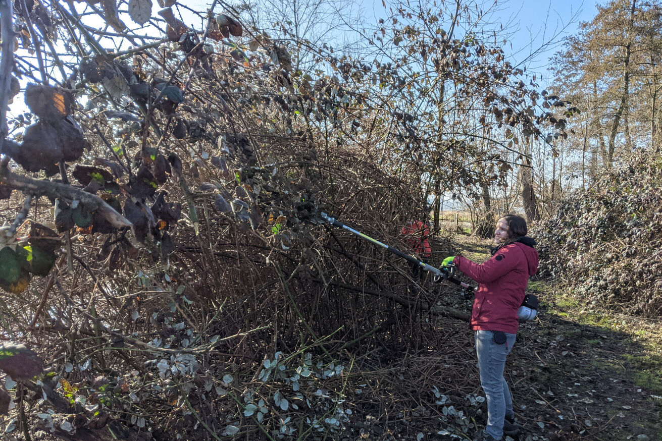 Zu Pflege- und Entwicklungsmaßnahmen können z.B. eine schonende Mahd per Handsense, Entkusselungsarbeiten oder die Anlage eines Laichgewässers für Amphibien gehören. Diese organisiert die Stiftung auch häufig als Arbeitseinsatz mit Zeitspender*innen.