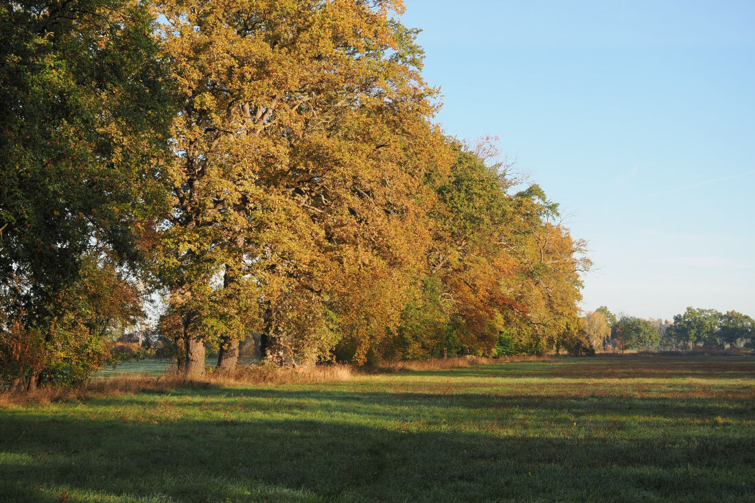 Relikte alter Kulturlandschaft, eingefasst von artenreichen Hecken und mächtigen Eichen, in denen unter anderem Rotmilan, Goldammer und Neuntöter brüten. Schon beim ersten Betreten waren wir von der extrem hohen Heuschreckendichte beeindruckt. Kranich und Weißstorch sind regelmäßige Nahrungsgäste. Kartierungen belegen den Pflanzenartenreichtum.