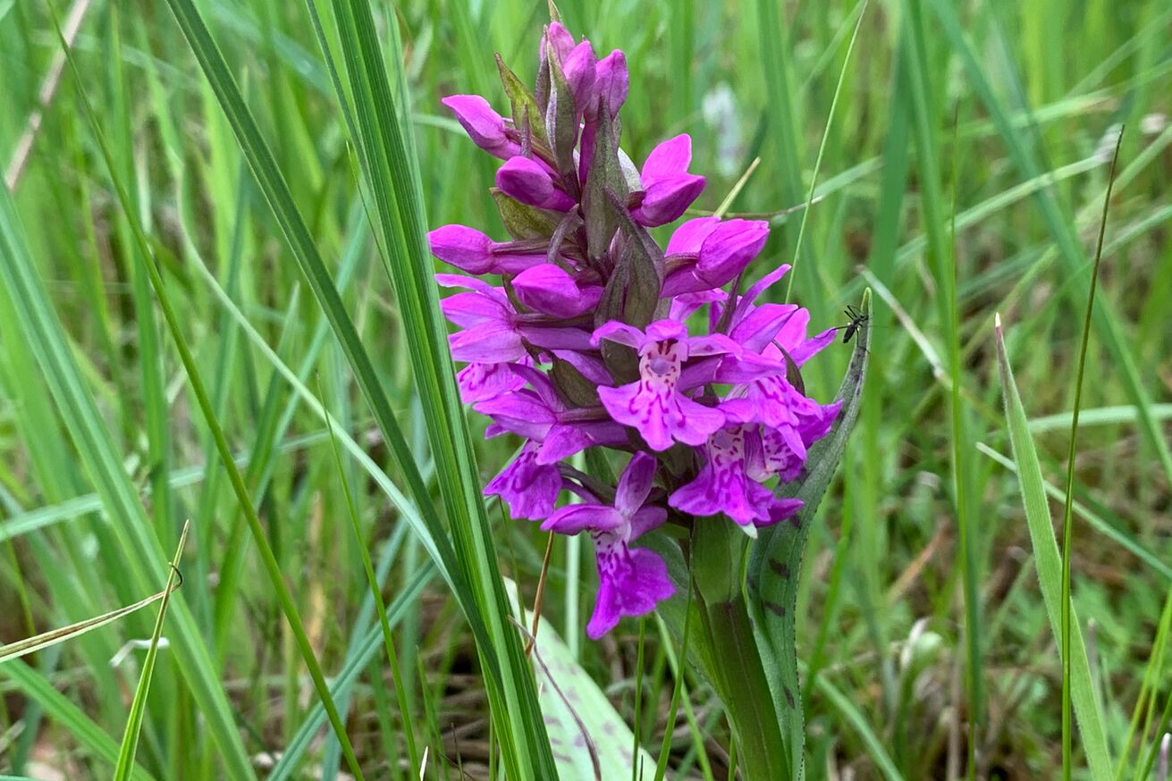 Unmittelbar an der polnischen Grenze, wo diese den Neuwarper See (eine Bucht des Stettiner Haffs) erreicht, liegt versteckt unsere seggenreiche Nasswiese. Hier blühen das Fleischfarbene und das Breitblättrige Knabenkraut, Schlangenknöterich, Schmalblättriges Wollgras und Fieberklee.